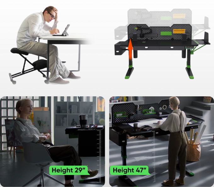 After prolonged strain on the neck and back, the automatic height adjustment from Earnly allows you to switch from sitting to standing with a single push of a button or via the intelligent app.