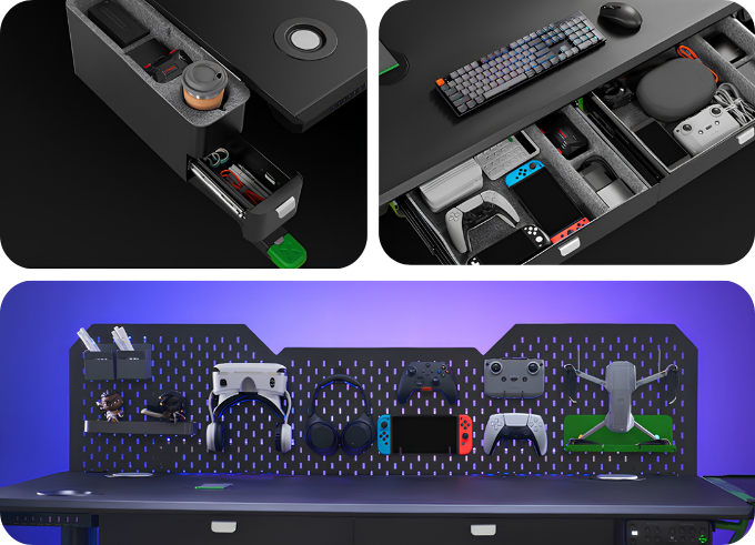 In addition, it features convenient pull-out drawers made of eco-friendly material, a back perforated board equipped with multiple hooks, a slide rail for monitor arm support, and a thoughtfully designed left-hanging storage cabinet to protect your small objects, providing seamlessly integrated storage space.